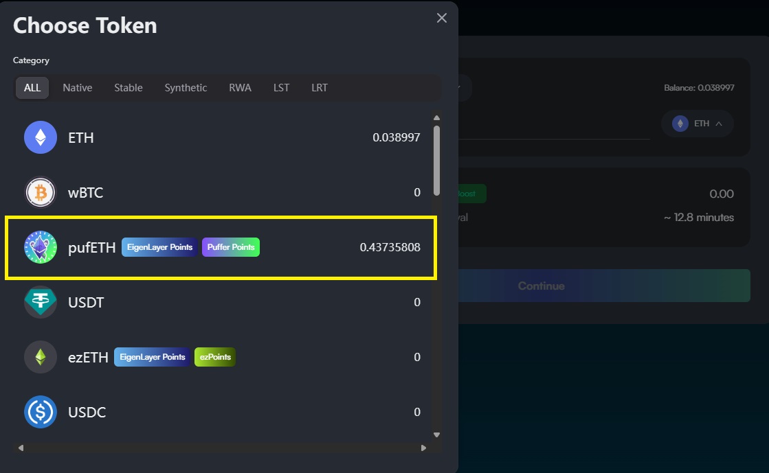 브릿지 버튼을 누르면 위와같이 브릿지 시킬 자산을 선택할 수 있습니다. 저는 pufETH를 브릿지합니다.