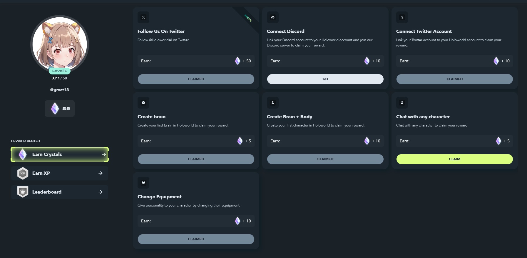 4) Earn Crystals 클릭해서 미션 수행