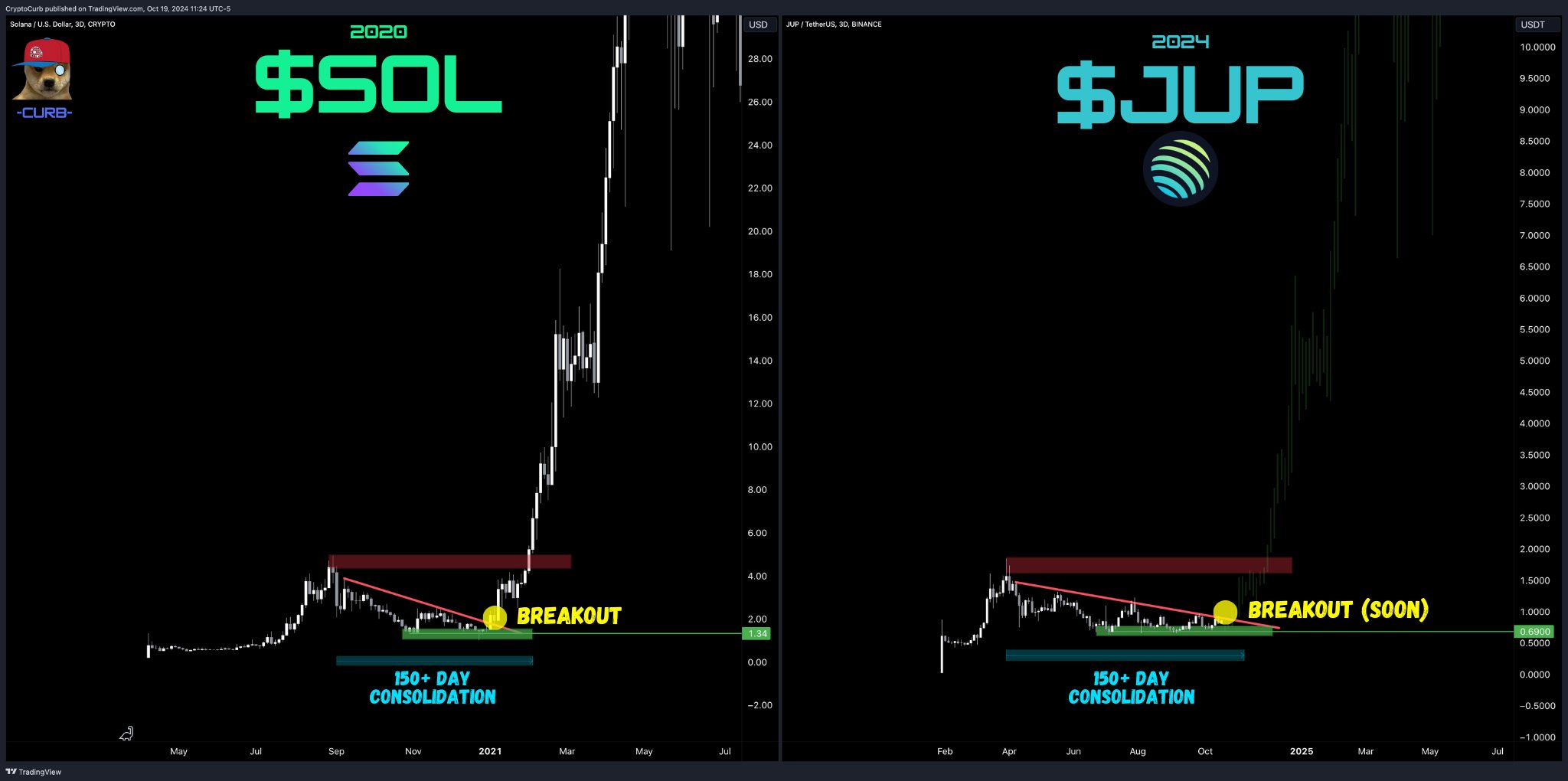 그런 @CryptoCurb는 최근 글을 통해 2020년 SOL 차트와 2024년 JUP 차트가 유사하며, 만약 이 지점을 브레이크아웃(돌파) 시 과거 솔라나가 보여줬던 가격 상승 퍼포먼스를 주피터 코인에서 기대할 수 있다고 설명했습니다.