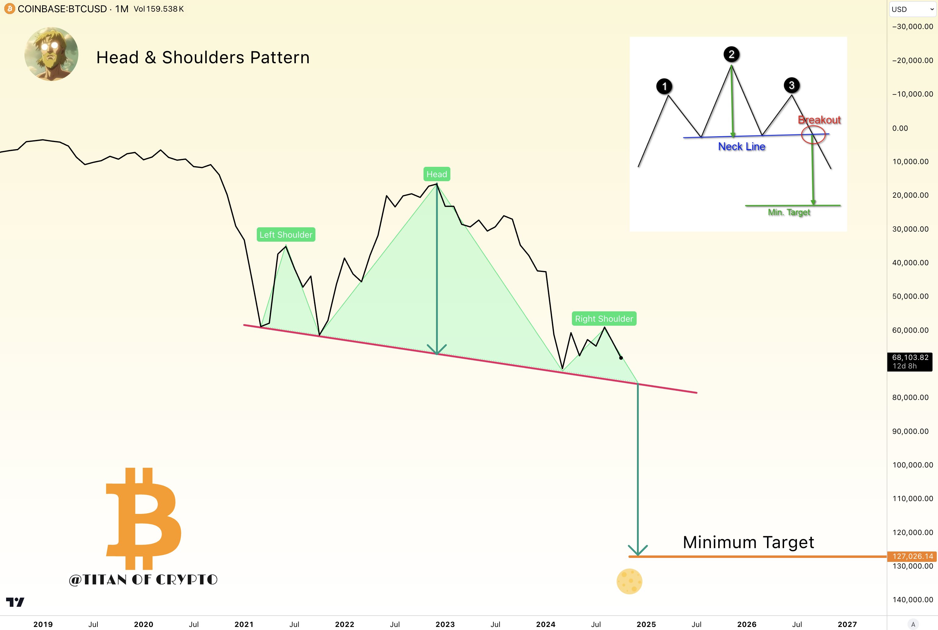 위 차트 역시 왼쪽어깨, 머리, 오른쪽어깨 라인 형성은 이전의 차트와 같습니다. 패턴의 넥라인을 돌파 시 비트코인 가격은 폭발적으로 하락할 것으로 예상되며, 그 시점은 2025년 상반기가 될 것입니다.