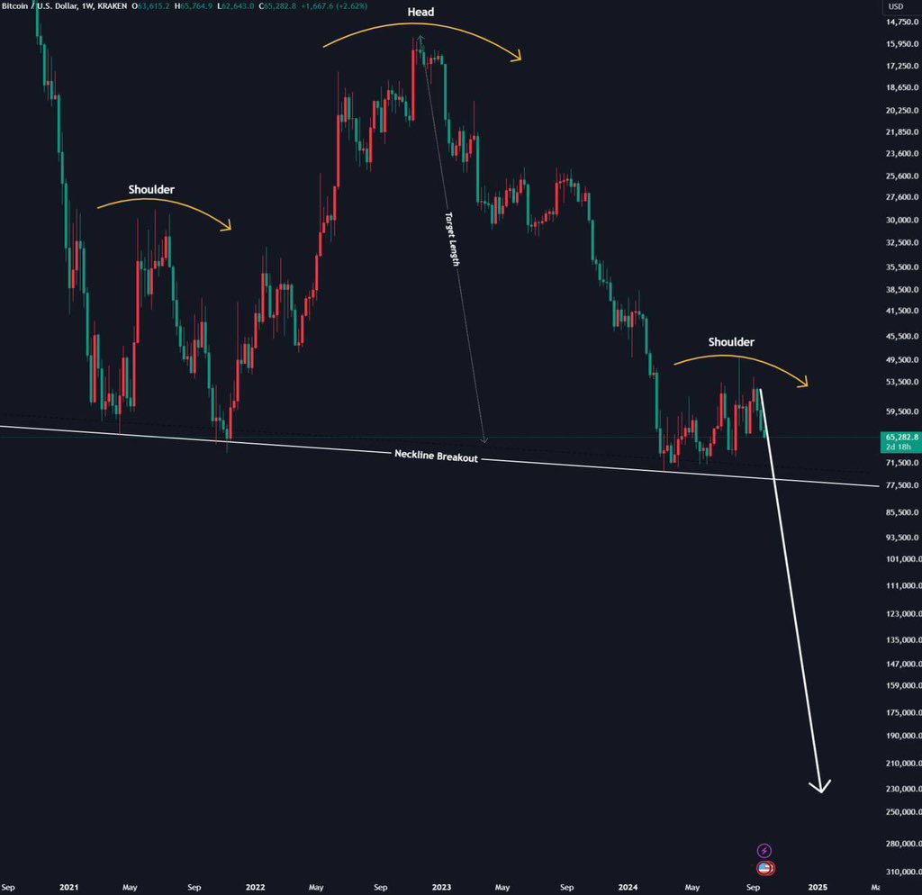 위 차트 역시 왼쪽어깨, 머리, 오른쪽어깨 라인 형성은 이전의 차트와 같습니다. 패턴의 넥라인을 돌파 시 비트코인 가격은 폭발적으로 하락할 것으로 예상되며, 그 시점은 2025년 상반기가 될 것입니다.