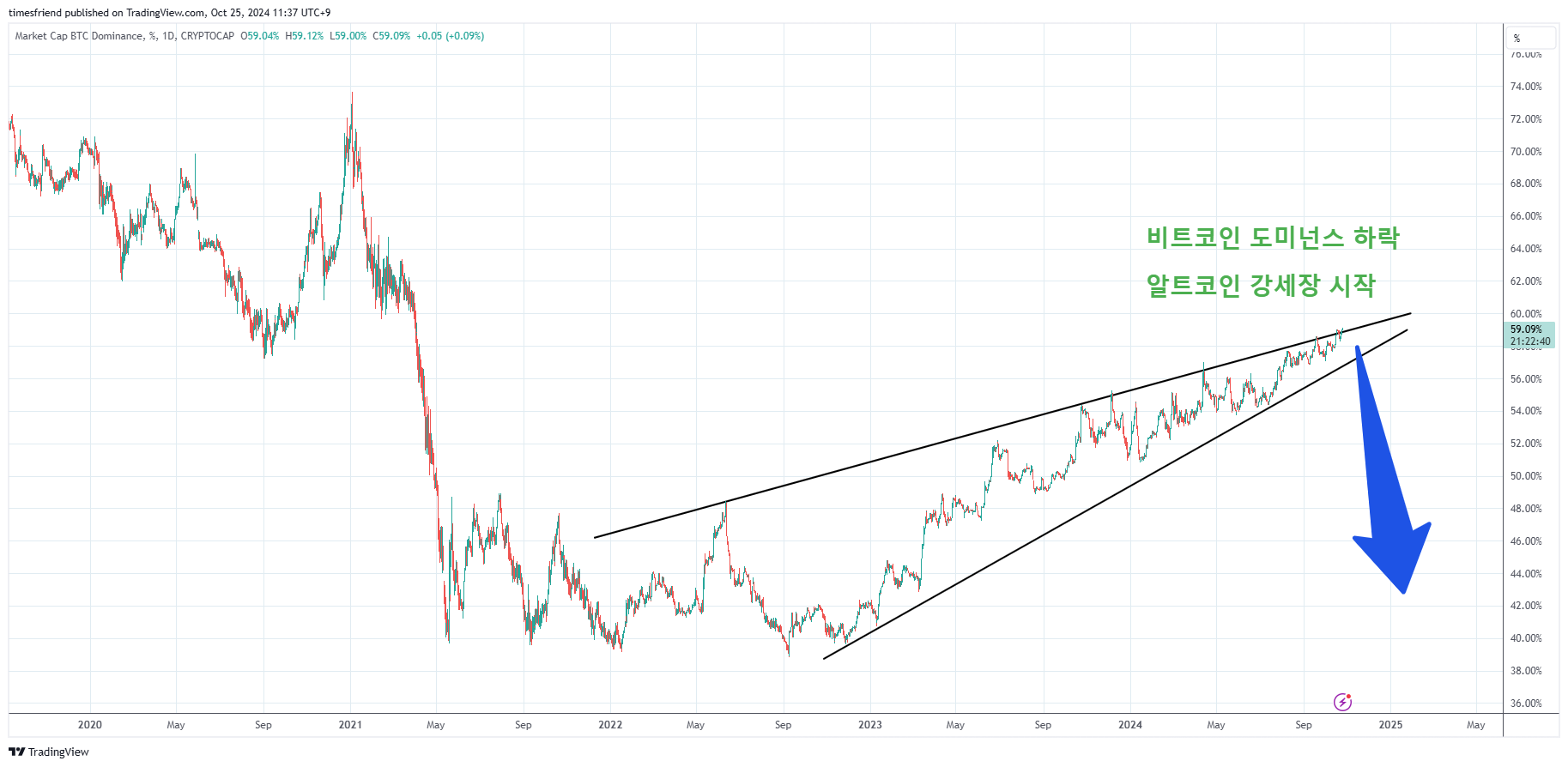 이번 포스팅에서는 비트코인 도미넌스와 알트코인 강세장의 상관관계에 대해서 알아봅니다. 비트코인의 가격 상승과 함께 비트코인 도미넌스(BTC.D)가 2021년 이후 최고 수준인 57.6%에 도달했습니다. 도미넌스는 암호화폐 시장에서 비트코인의 시가총액 비중을 나타내며, 이 지표의 변동은 시장 참여자들에게 중요한 신호로 인식됩니다.