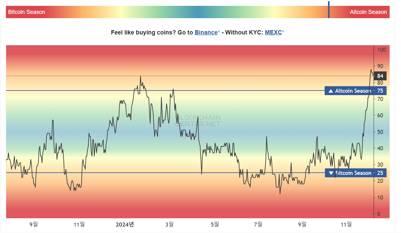 알트코인 시즌 인덱스 지수는 현재 84를 기록하며 강한 상승 신호를 나타내고 있습니다. 75를 돌파할 경우 본격적인 알트코인 시즌이 선언되는데, 현재 알트코인 시장은 비트코인의 단기 조정기에 강한 반등세를 보이며 투자자들의 위험 선호 심리를 자극하고 있습니다.
