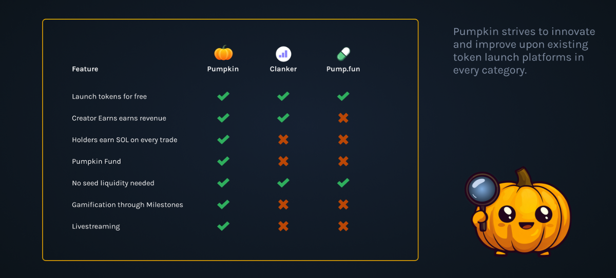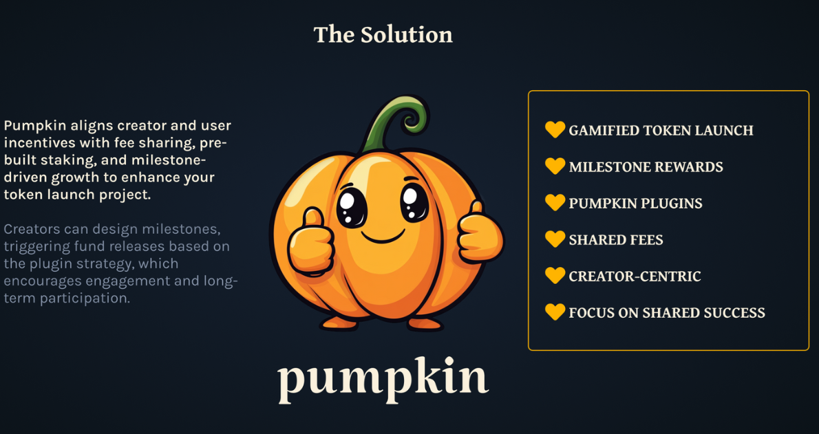 Pumpkin은 Solana 블록체인을 기반으로 한 토큰 론칭 플랫폼입니다. 단순한 토큰 출시를 넘어, 프로젝트 크리에이터와 토큰 홀더가 장기적으로 함께 성장할 수 있도록 설계되었습니다. 이를 위해 거래 수수료 공유, 스테이킹 보상, 단계별 목표 달성 보상 시스템 등을 도입하였습니다.